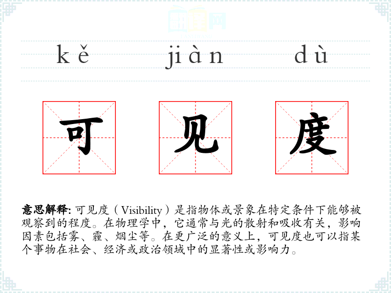 “可见度”一词源自英语单词“visibility”,其词根与“visible”(可见的)相关。在语言演变中,它从描述物理现象扩展到描述社会现象,如品牌或个人的知名度。