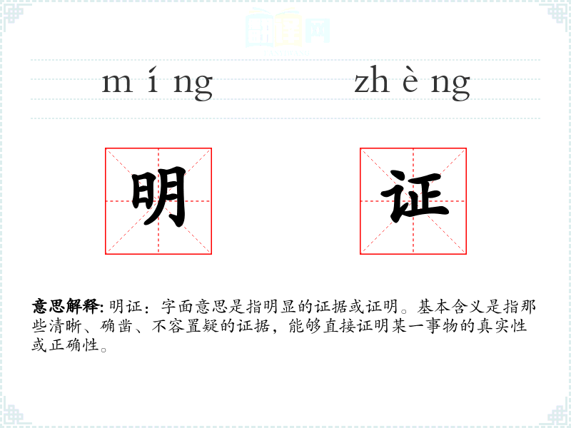 明证:字面意思是指明显的证据或证明。基本含义是指那些清晰、确凿、不容置疑的证据,能够直接证明某一事物的真实性或正确性。