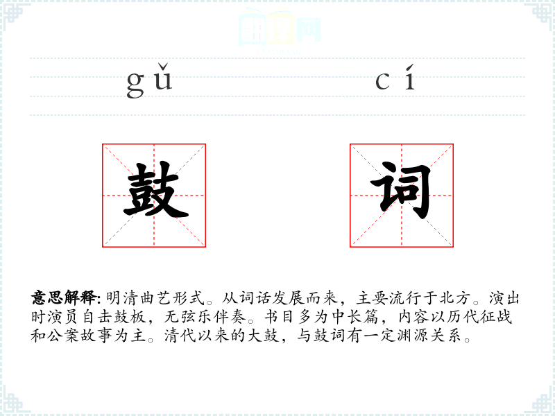 明清曲艺形式。从词话发展而来,主要流行于北方。演出时演员自击鼓板,无弦乐伴奏。书目多为中长篇,内容以历代征战和公案故事为主。清代以来的大鼓,与鼓词有一定渊源关系。