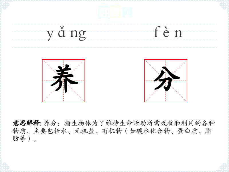 养分:指生物体为了维持生命活动所需吸收和利用的各种物质,主要包括水、无机盐、有机物(如碳水化合物、蛋白质、脂肪等)。