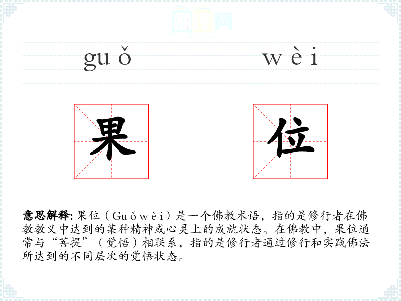 果位(Guǒwèi)是一个术语,指的是修行者在教义中达到的某种精神或心灵上的成就状态。在**中,果位通常与“菩提”(觉悟)相联系,指的是修行者通过修行和实践佛法所达到的不同层次的觉悟状态。