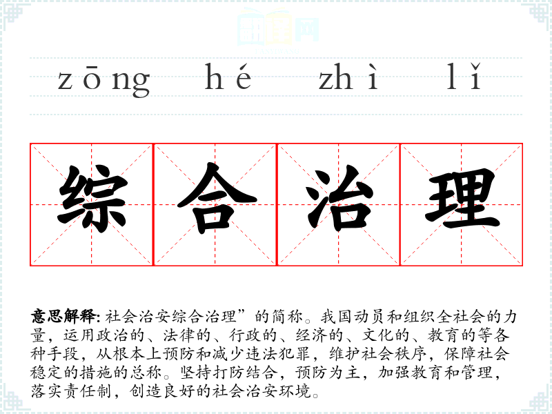 社会治安综合治理”的简称。我国动员和组织全社会的力量,运用政治的、法律的、行政的、经济的、文化的、教育的等各种手段,从根本上预防和减少违法犯罪,维护社会秩序,保障社会稳定的措施的总称。坚持打防结合,预防为主,加强教育和管理,落实责任制,创造良好的社会治安环境。