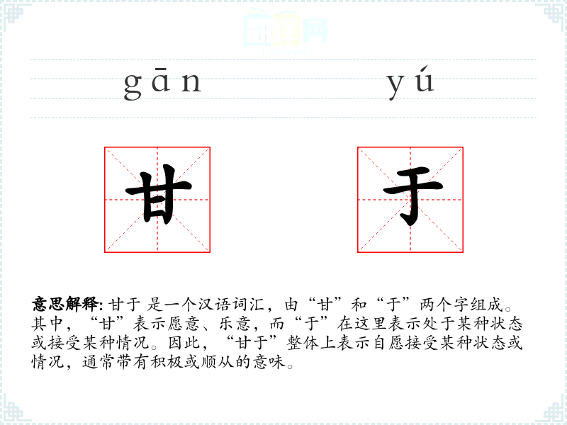 甘于 的词源较为直接,由“甘”和“于”两个常用汉字组成。在古代汉语中,“甘”已有愿意、乐意的含义,而“于”作为介词,表示处于某种状态。随着语言的发展,这两个字组合在一起,形成了表示自愿接受某种状态的词汇。