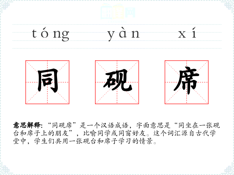 “同砚席”是一个汉语成语,字面意思是“同坐在一张砚台和席子上的朋友”,比喻同学或同窗好友。这个词汇源自古代学堂中,学生们共用一张砚台和席子学*的情景。