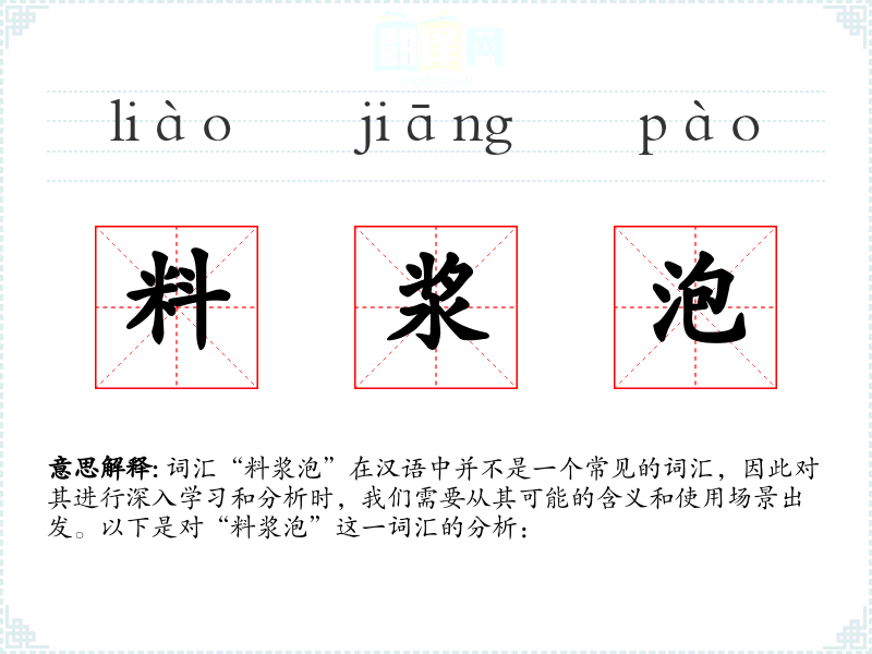 词汇“料浆泡”在汉语中并不是一个常见的词汇,因此对其进行深入学习和分析时,我们需要从其可能的含义和使用场景出发。以下是对“料浆泡”这一词汇的分析: