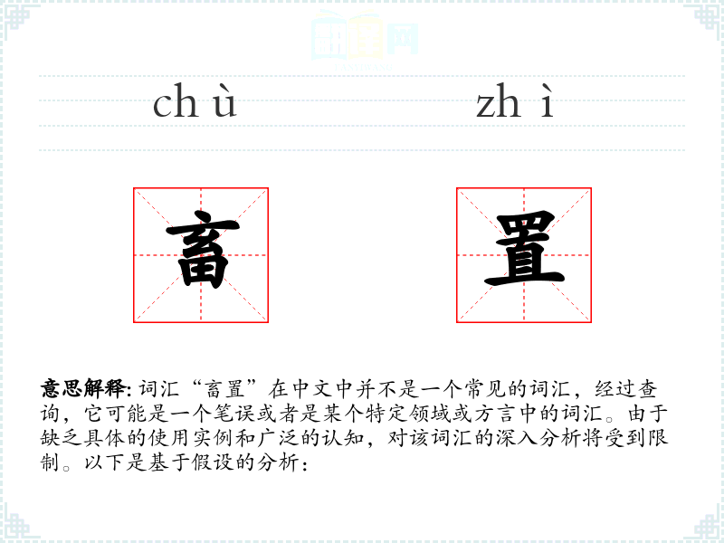 词汇“畜置”在中文中并不是一个常见的词汇,经过查询,它可能是一个笔误或者是某个特定领域或方言中的词汇。由于缺乏具体的使用实例和广泛的认知,对该词汇的深入分析将受到限制。以下是基于假设的分析: