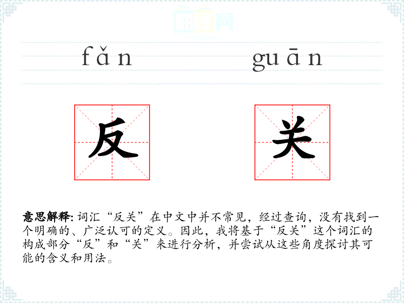 由于“反关”不是一个标准词汇,我们可以推测其字面意思可能是“反对或违反某种关系或关联”。这里的“反”通常表示反对、相反或违反,而“关”则可能指关系、关联或联系。