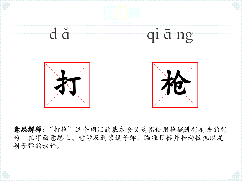 “打枪”这个词汇的基本含义是指使用枪械进行射击的行为。在字面意思上,它涉及到装填子弹、瞄准目标并扣动扳机以发射子弹的动作。