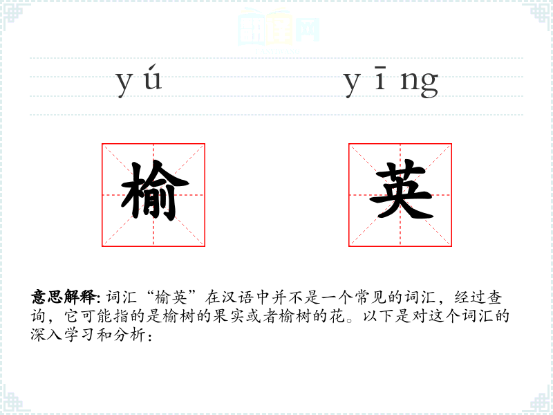 词汇“榆英”在汉语中并不是一个常见的词汇,经过查询,它可能指的是榆树的果实或者榆树的花。以下是对这个词汇的深入学*和分析: