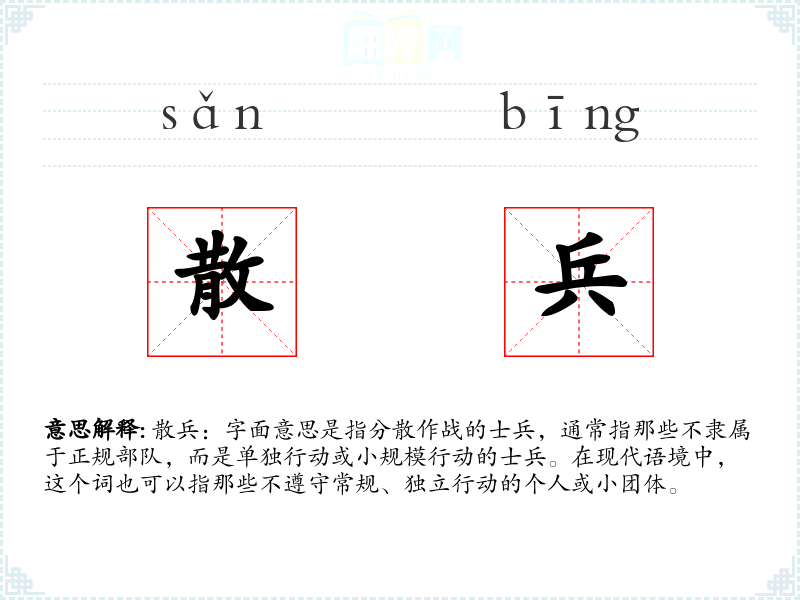 散兵:字面意思是指分散作战的士兵,通常指那些不隶属于正规部队,而是单独行动或小规模行动的士兵。在现代语境中,这个词也可以指那些不遵守常规、独立行动的个人或小团体。
