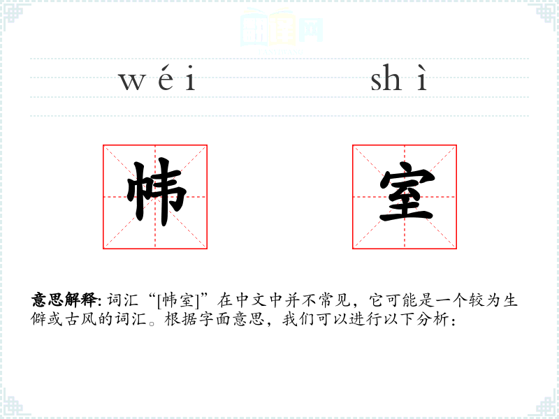 词汇“[帏室]”在中文中并不常见,它可能是一个较为生僻或古风的词汇。根据字面意思,我们可以进行以下分析: