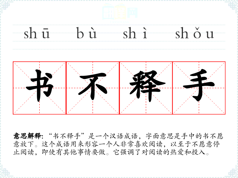 “书不释手”是一个汉语成语,字面意思是手中的书不愿意放下。这个成语用来形容一个人非常喜欢阅读,以至于不愿意停止阅读,即使有其他事情要做。它强调了对阅读的热爱和投入。