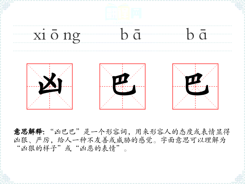 “凶巴巴”是一个形容词,用来形容人的态度或表情显得凶狠、严厉,给人一种不友善或威胁的感觉。字面意思可以理解为“凶狠的样子”或“凶恶的表情”。