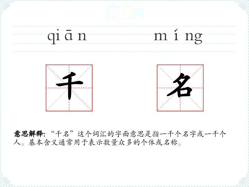 “千名”这个词汇的字面意思是指一千个名字或一千个人。基本含义通常用于表示数量众多的个体或名称。