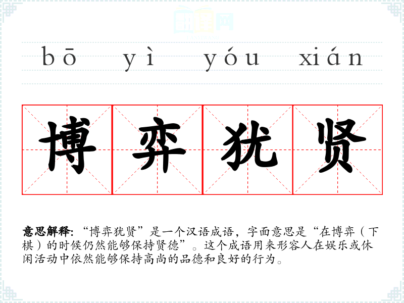 “博弈犹贤”是一个汉语成语,字面意思是“在博弈(下棋)的时候仍然能够保持贤德”。这个成语用来形容人在娱乐或休闲活动中依然能够保持高尚的品德和良好的行为。