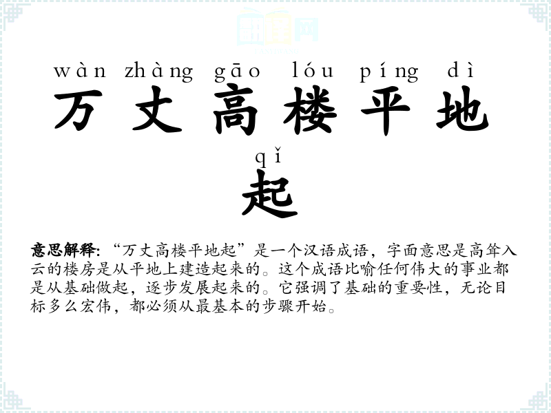 “万丈高楼平地起”是一个汉语成语,字面意思是高耸入云的楼房是从平地上建造起来的。这个成语比喻任何伟大的事业都是从基础做起,逐步发展起来的。它强调了基础的重要性,无论目标多么宏伟,都必须从最基本的步骤开始。