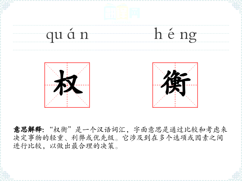 “权衡”是一个汉语词汇,字面意思是通过比较和考虑来决定事物的轻重、利弊或优先级。它涉及到在多个选项或因素之间进行比较,以做出最合理的决策。