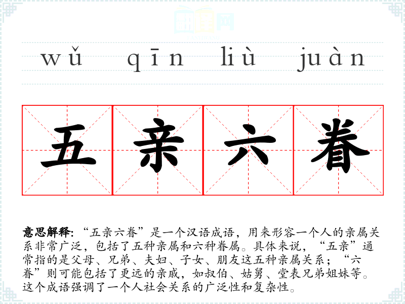 “五亲六眷”是一个汉语成语,用来形容一个人的亲属关系非常广泛,包括了五种亲属和六种眷属。具体来说,“五亲”通常指的是父母、兄弟、夫妇、子女、朋友这五种亲属关系;“六眷”则可能包括了更远的亲戚,如叔伯、姑舅、堂表兄弟姐妹等。这个成语强调了一个人社会关系的广泛性和复杂性。