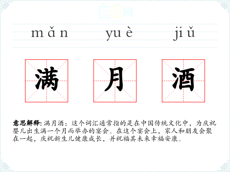 满月酒:这个词汇通常指的是在**传统文化中,为庆祝婴儿出生满一个月而举办的宴会。在这个宴会上,家人和朋友会聚在一起,庆祝新生儿健康成长,并祝福其未来幸福安康。
