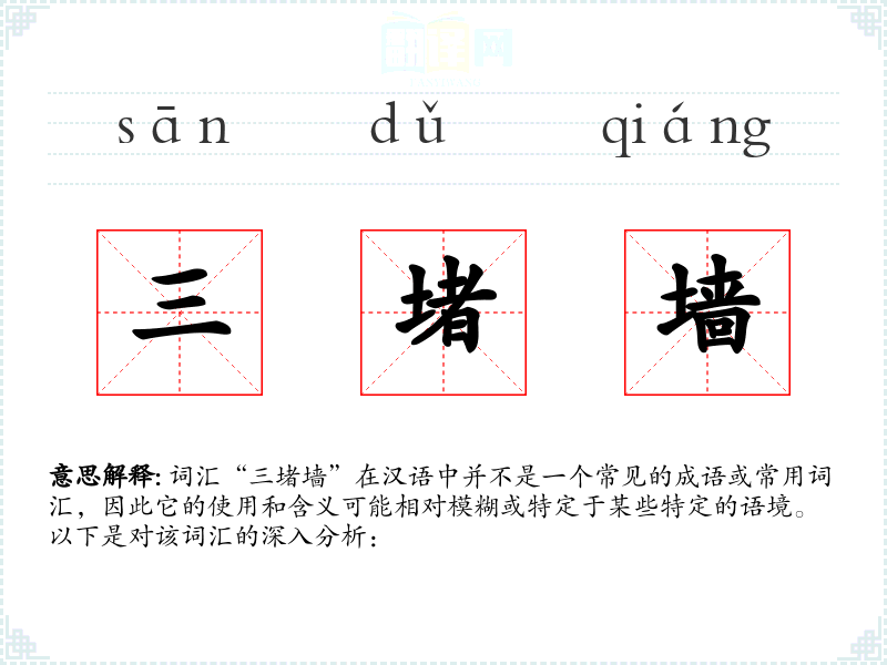 词汇“三堵墙”在汉语中并不是一个常见的成语或常用词汇,因此它的使用和含义可能相对模糊或特定于某些特定的语境。以下是对该词汇的深入分析: