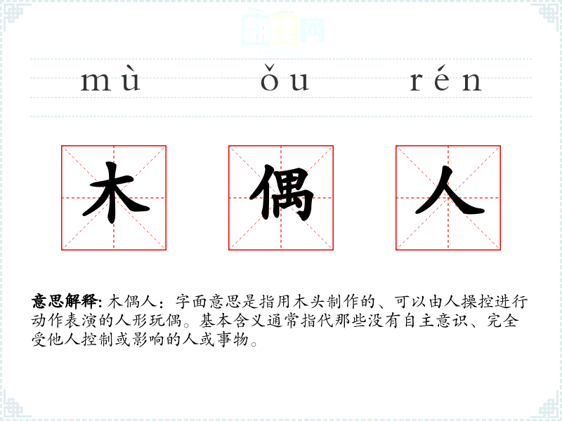 木偶人:字面意思是指用木头制作的、可以由人操控进行动作表演的人形玩偶。基本含义通常指代那些没有自主意识、完全受他人控制或影响的人或事物。