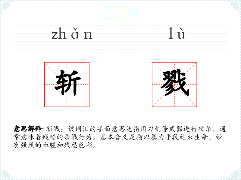 斩戮:该词汇的字面意思是指用刀剑等武器进行砍杀,通常意味着残酷的杀戮行为。基本含义是指以暴力手段结束生命,带有强烈的血腥和残忍色彩。