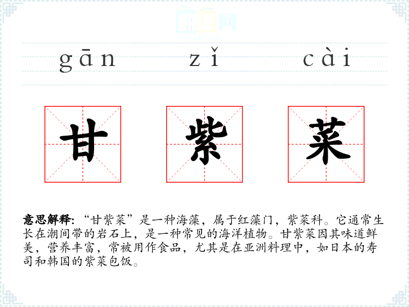 同义词:紫菜、海苔 反义词:(由于甘紫菜是一种特定的海藻,没有直接的反义词,但可以考虑与陆生植物相对比)