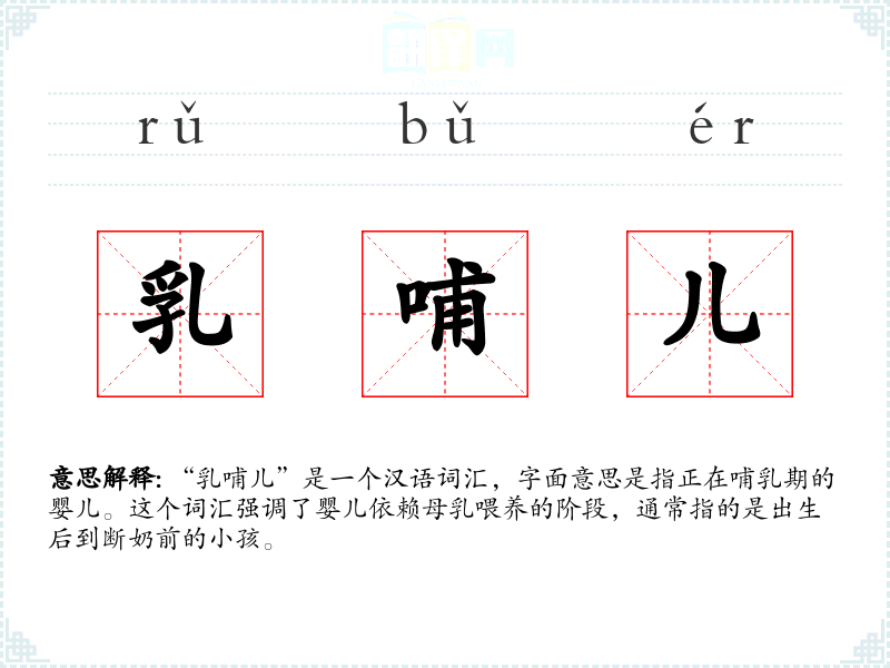 “乳哺儿”是一个汉语词汇,字面意思是指正在哺乳期的婴儿。这个词汇强调了婴儿依赖母乳喂养的阶段,通常指的是出生后到断奶前的小孩。