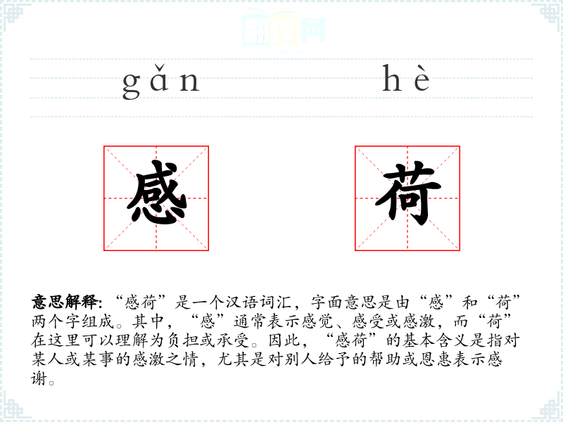 “感荷”是一个汉语词汇,字面意思是由“感”和“荷”两个字组成。其中,“感”通常表示感觉、感受或感激,而“荷”在这里可以理解为负担或承受。因此,“感荷”的基本含义是指对某人或某事的感激之情,尤其是对别人给予的帮助或恩惠表示感谢。