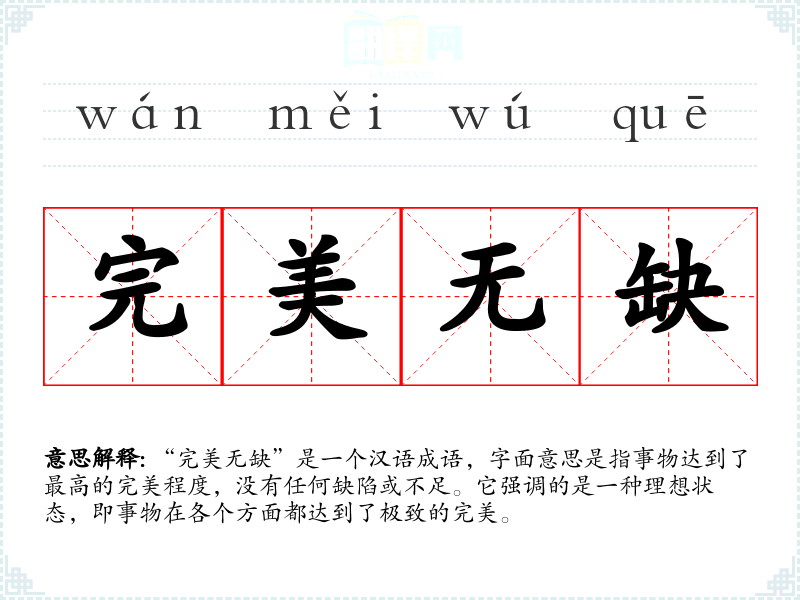 “完美无缺”是一个汉语成语,字面意思是指事物达到了最高的完美程度,没有任何缺陷或不足。它强调的是一种理想状态,即事物在各个方面都达到了极致的完美。