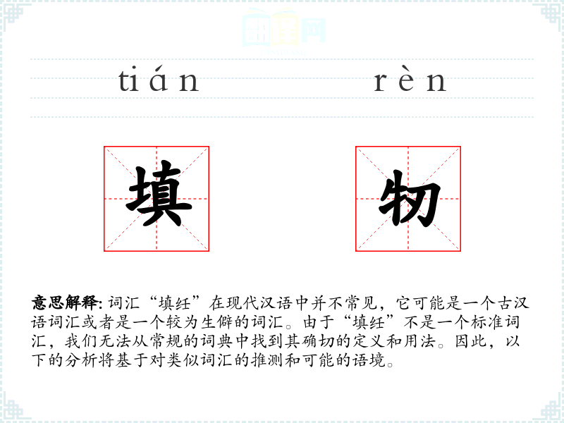 词汇“填纴”在现代汉语中并不常见,它可能是一个古汉语词汇或者是一个较为生僻的词汇。由于“填纴”不是一个标准词汇,我们无法从常规的词典中找到其确切的定义和用法。因此,以下的分析将基于对类似词汇的推测和可能的语境。