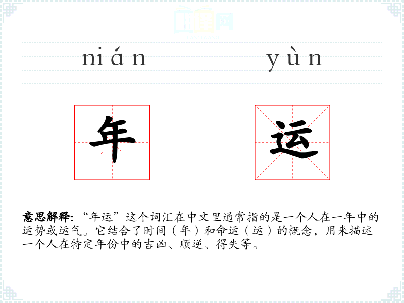 “年运”这个词汇在中文里是一个富有文化内涵的词汇,它不仅涉及到个人的运势,还与整个社会的文化传统和俗紧密相关。在学这个词汇时,我更加理解了**人对时间和命运的重视,以及如何通过语言来表达这种文化观念。