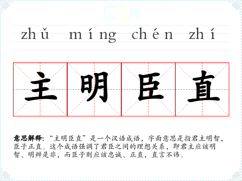 “主明臣直”是一个汉语成语,字面意思是指君主明智,臣子正直。这个成语强调了君臣之间的理想关系,即君主应该明智、明辨是非,而臣子则应该忠诚、正直,直言不讳。