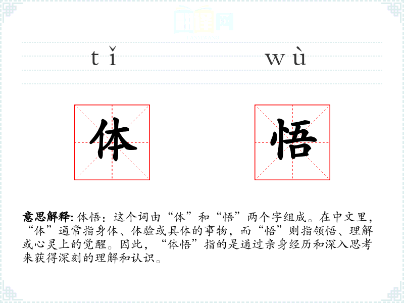 体悟:这个词由“体”和“悟”两个字组成。在中文里,“体”通常指身体、体验或具体的事物,而“悟”则指领悟、理解或心灵上的觉醒。因此,“体悟”指的是通过亲身经历和深入思考来获得深刻的理解和认识。