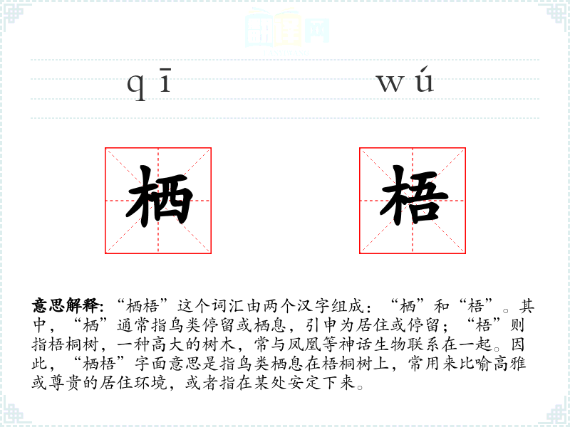 “栖梧”这个词汇由两个汉字组成:“栖”和“梧”。其中,“栖”通常指鸟类停留或栖息,引申为居住或停留;“梧”则指梧桐树,一种高大的树木,常与凤凰等神话生物联系在一起。因此,“栖梧”字面意思是指鸟类栖息在梧桐树上,常用来比喻高雅或尊贵的居住环境,或者指在某处安定下来。