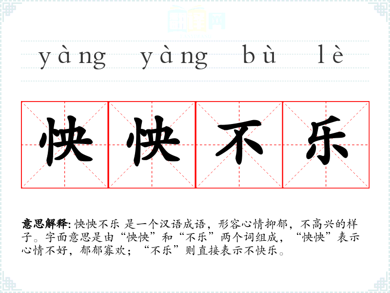 怏怏不乐 是一个汉语成语,形容心情抑郁,不高兴的样子。字面意思是由“怏怏”和“不乐”两个词组成,“怏怏”表示心情不好,郁郁寡欢;“不乐”则直接表示不快乐。