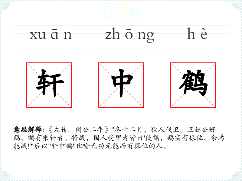 《左传.闵公二年》"冬十二月,狄人伐卫。卫懿公好鹤,鹤有乘轩者。将战,国人受甲者皆曰'使鹤,鹤实有禄位,余焉能战!'"后以"轩中鹤"比喻无功无能而有禄位的人。