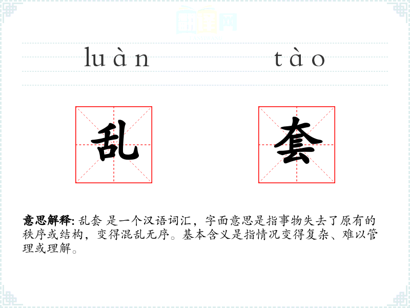 乱套 是一个汉语词汇,字面意思是指事物失去了原有的秩序或结构,变得混乱无序。基本含义是指情况变得复杂、难以管理或理解。