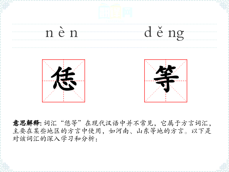 词汇“恁等”在现代汉语中并不常见,它属于方言词汇,主要在某些地区的方言中使用,如河南、山东等地的方言。以下是对该词汇的深入学习和分析: