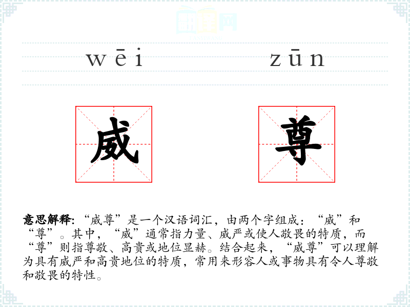 “威尊”这个词在汉语中具有丰富的文化内涵和历史背景,它不仅描述了外在的威严和高贵,也反映了内在的尊严和尊重。在语言学*和表达中,理解和正确使用这样的词汇,有助于丰富我们的语言表达,并更好地理解文化传统。