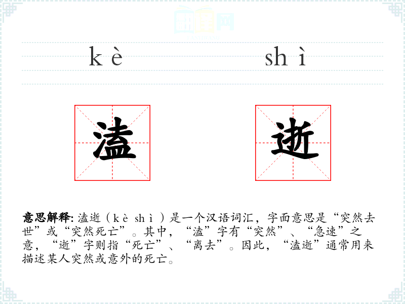 溘逝(kè shì)是一个汉语词汇,字面意思是“突然去世”或“突然死亡”。其中,“溘”字有“突然”、“急速”之意,“逝”字则指“死亡”、“离去”。因此,“溘逝”通常用来描述某人突然或意外的死亡。
