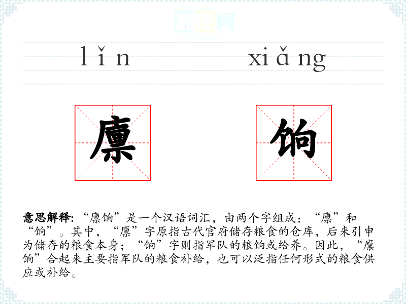 - 反义词:(由于“廪饷”特指供应,反义词较少)短缺、匮乏