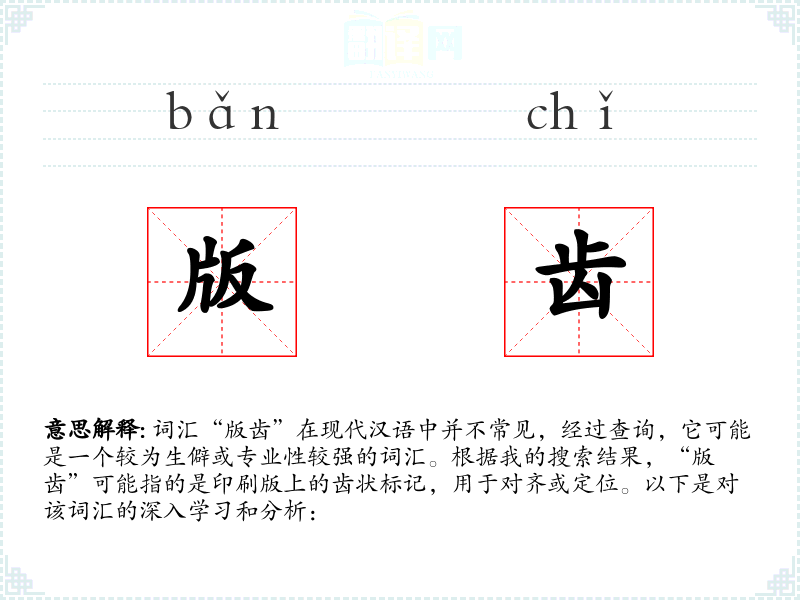 词汇“版齿”在现代汉语中并不常见,经过查询,它可能是一个较为生僻或专业性较强的词汇。根据我的搜索结果,“版齿”可能指的是印刷版上的齿状标记,用于对齐或定位。以下是对该词汇的深入学习和分析: