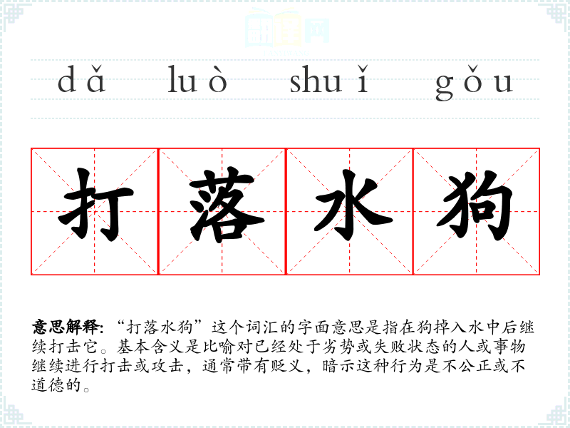 “打落水狗”这个词汇的字面意思是指在狗掉入水中后继续打击它。基本含义是比喻对已经处于劣势或失败状态的人或事物继续进行打击或攻击,通常带有贬义,暗示这种行为是不公正或不道德的。