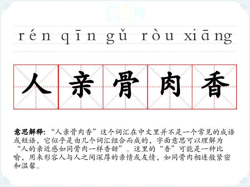 “人亲骨肉香”这个词汇在中文里并不是一个常见的成语或短语,它似乎是由几个词汇组合而成的,字面意思可以理解为“人的亲近感如同骨肉一样香甜”。这里的“香”可能是一种比喻,用来形容人与人之间深厚的亲情或友情,如同骨肉相连般紧密和温馨。