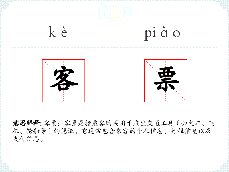 - 同义词:车票、机票、船票。这些词汇在特定交通工具上可以互换使用,但“客票”更通用,可以涵盖所有类型的交通工具。