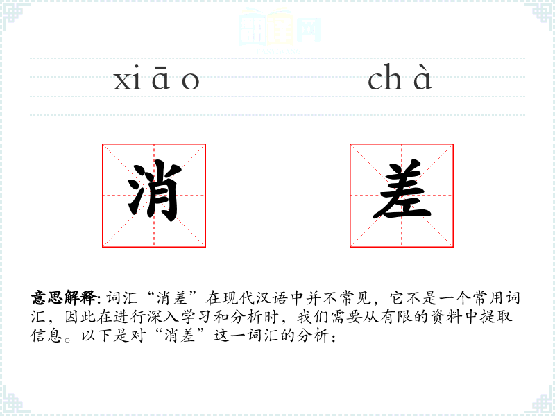 词汇“消差”在现代汉语中并不常见,它不是一个常用词汇,因此在进行深入学习和分析时,我们需要从有限的资料中提取信息。以下是对“消差”这一词汇的分析: