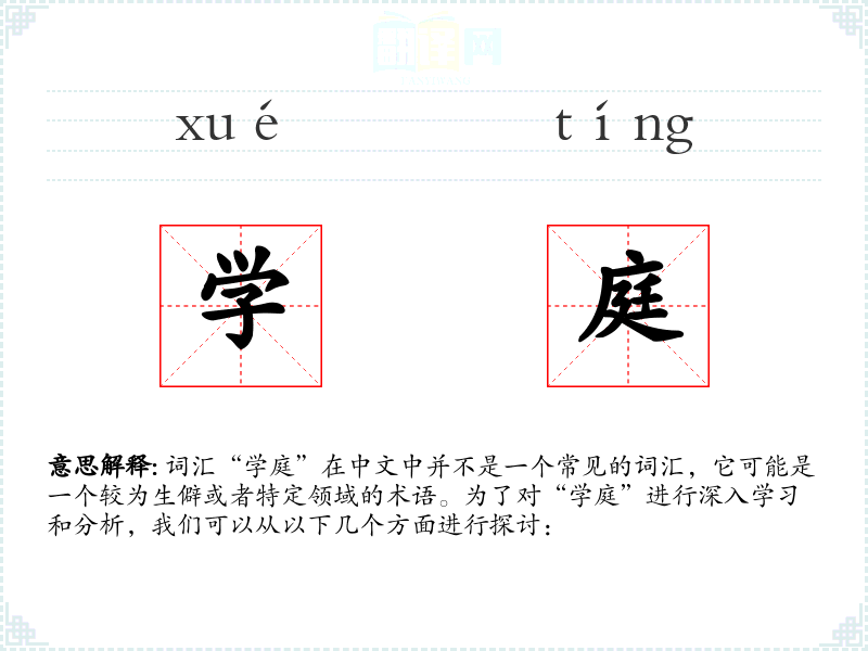 词汇“学庭”在中文中并不是一个常见的词汇,它可能是一个较为生僻或者特定领域的术语。为了对“学庭”进行深入学*和分析,我们可以从以下几个方面进行探讨: