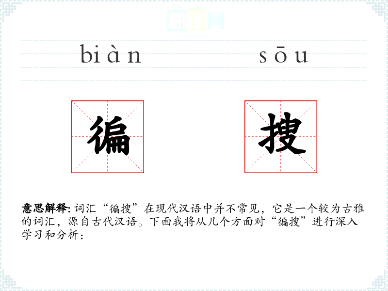 通过对“徧搜”这个词汇的学习和分析,我们可以更好地理解其在古代汉语中的使用情况和意义。虽然现代汉语中使用频率不高,但其在文学作品和特定语境中仍有一定的价值。了解这样的古雅词汇,有助于丰富我们的语言知识和文化素养。