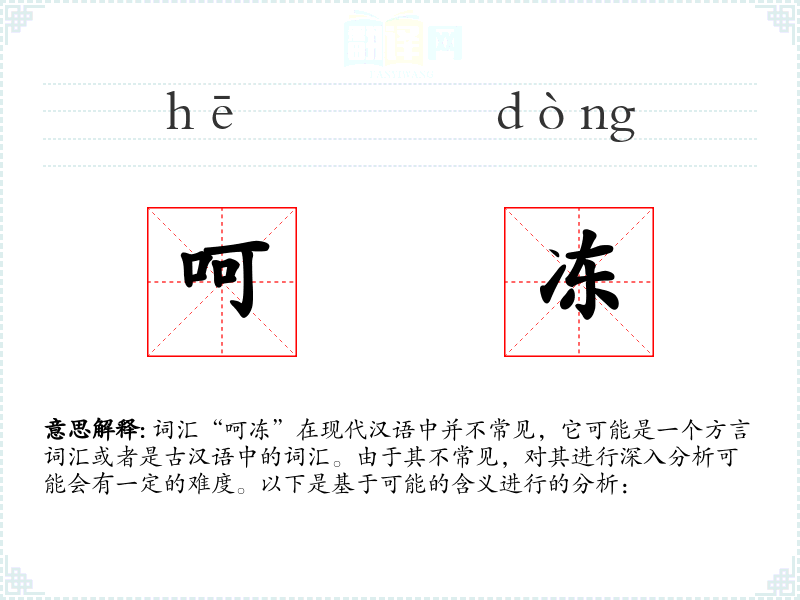 词汇“呵冻”在现代汉语中并不常见,它可能是一个方言词汇或者是古汉语中的词汇。由于其不常见,对其进行深入分析可能会有一定的难度。以下是基于可能的含义进行的分析: